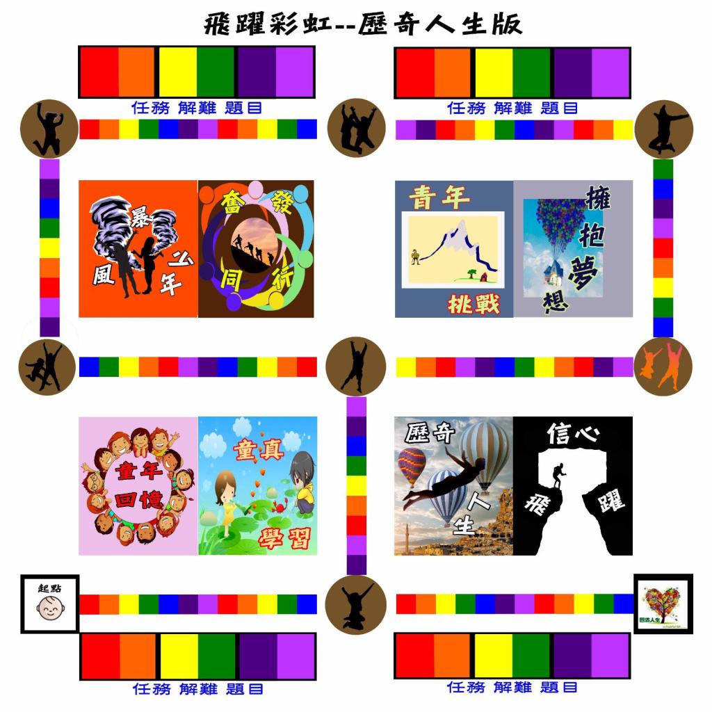 飛躍彩虹一一歷奇人生boardgame ]是資深青少年和導師coaching 和創意牧養遊戲硏究家SiuBox的新近精心硏發(2019年)。這個2-3小時的桌上遊戲導引青年到不同年紀的成年人反思生命內外程丶並在有趣的交流互動下探索人生成長的歷程:童年丶少年丶青年到成年。每位參與者都是神所寶貴的master piece,在短短幾小時,舊新知坦誠以真我交談分享,認識彩虹路上和人生歷奇往往影嚮我們的性格丶人際成長丶生命信念的塑造。這創新室內遊戲教我們在互動啟發下丶交流鼓勵,進而思考世界時局衝擊,整理情緒得著力量重新出發丶當中提供的想像力、發出的感染力,雙向的啓發和交流,都能叫人重新想像生命和世界的可能。大家肢體守望相扶,抱有希望和盼望,保守神賜下的童心和想像力,繼續在憂患的時局下歷奇生命的成長。