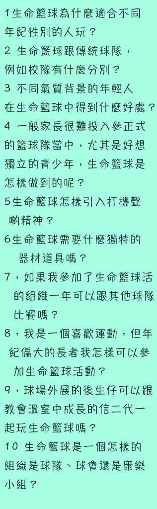 生命籃球在比賽、教練觀訓練、隊友隊友和組織都有更新,是以基督的精神作比賽集訓模式,