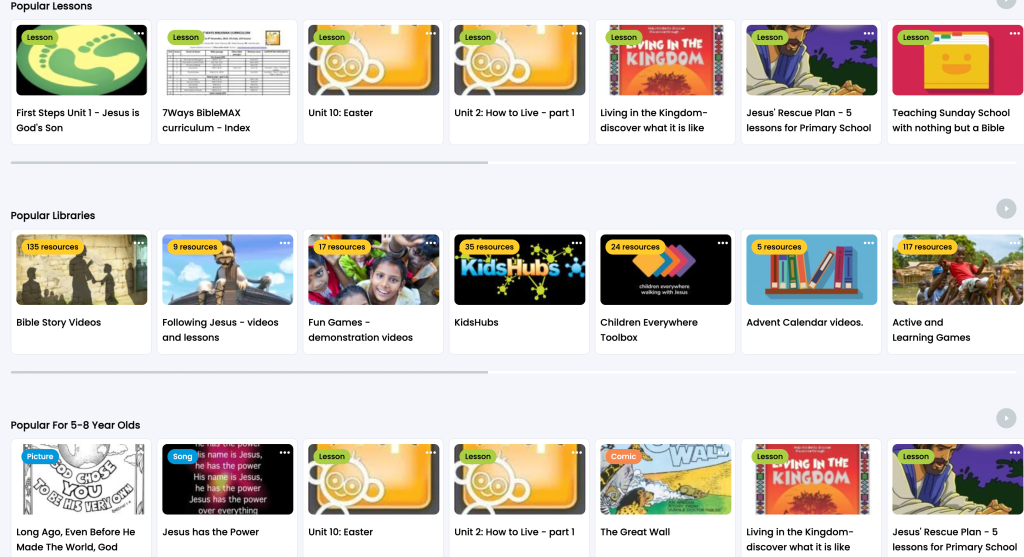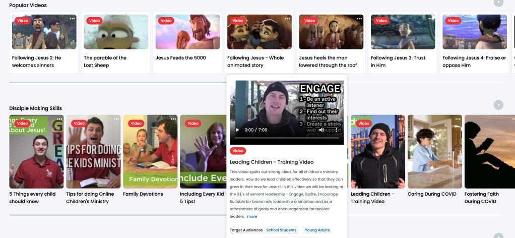 材、培訓資料、遊戲、教案、運動員見證、聖經故事短片、詩歌、活動例子等等。