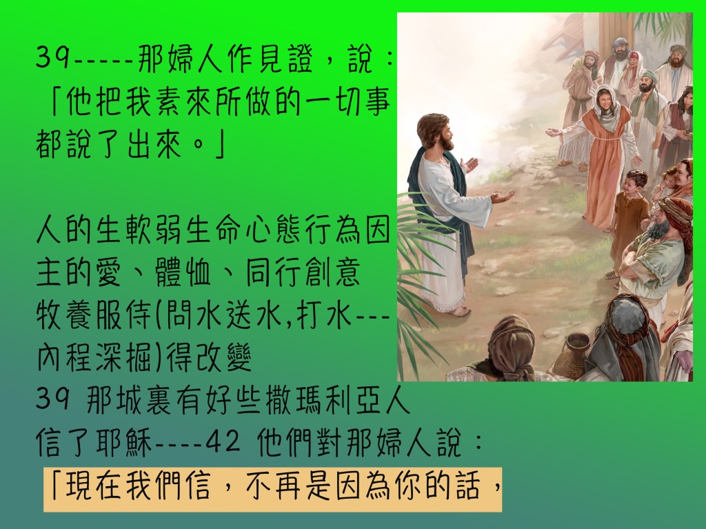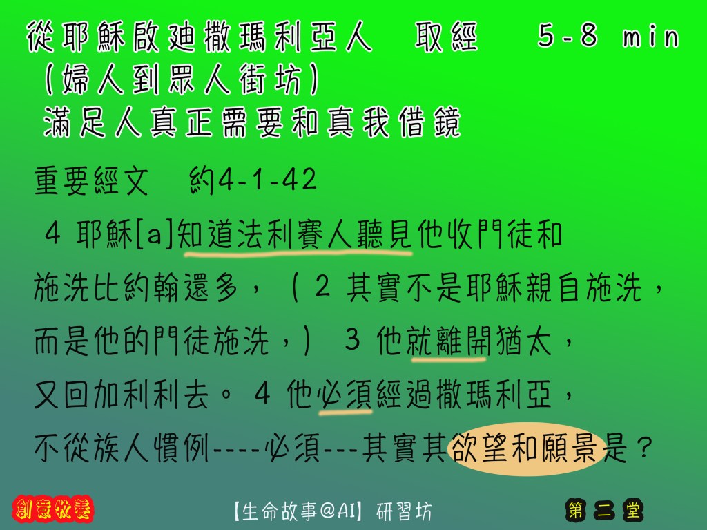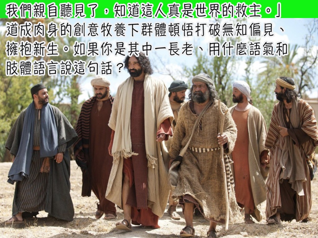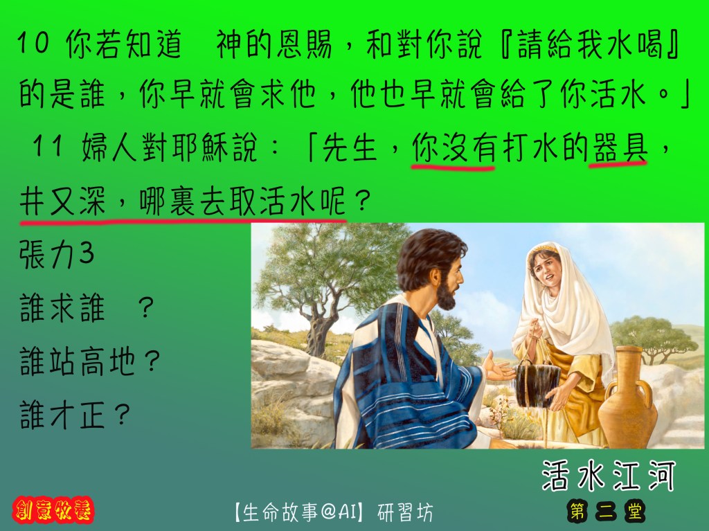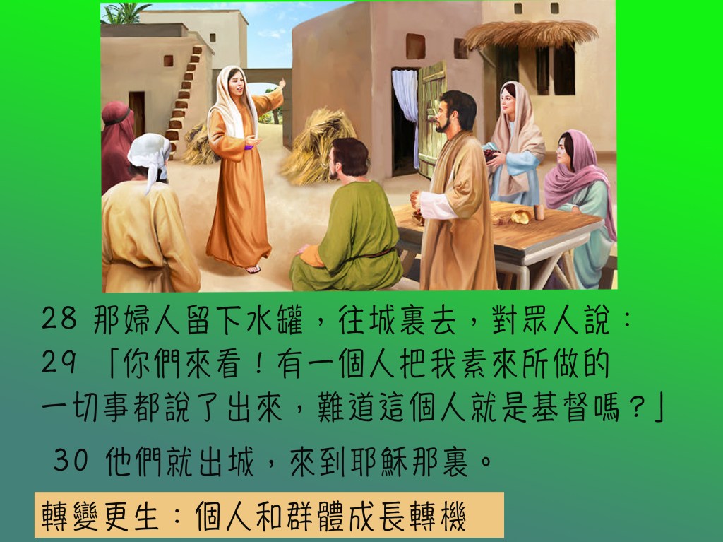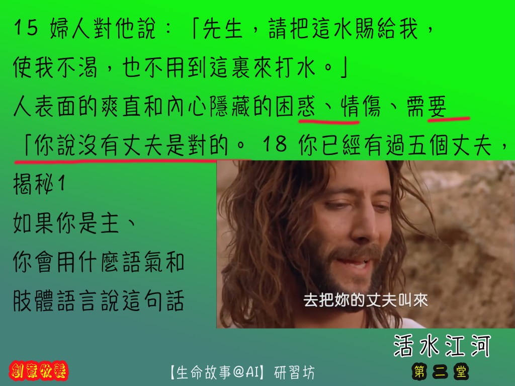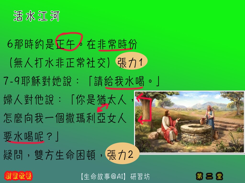 前提:一個受諸般打壓欺凌的心靈(人子耶穌),在非常時份(無人打水非正常社交),遇上另一 被人打壓排擠的『不道德』婦人(受壓者) ,幾個無厘頭、牛頭唔答馬咀互動後,得著心連心同行,生命更生大膽向街坊作見証。眾街坊因而跟生命的主也結下得救重生的因緣。個人和群族的世代信仰生活生命的情傷也在活水中得醫治。