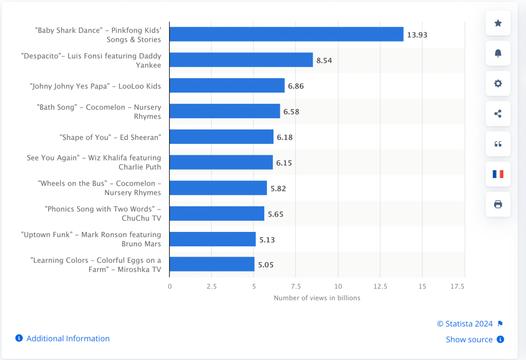 榜首 Baby Shark Dance” by Pinkfong Baby Shark – Kids’ Songs & Stories Views: 10.06 billion